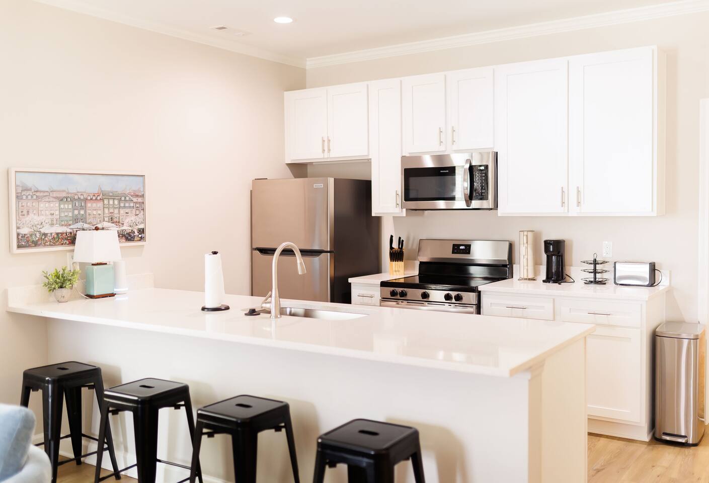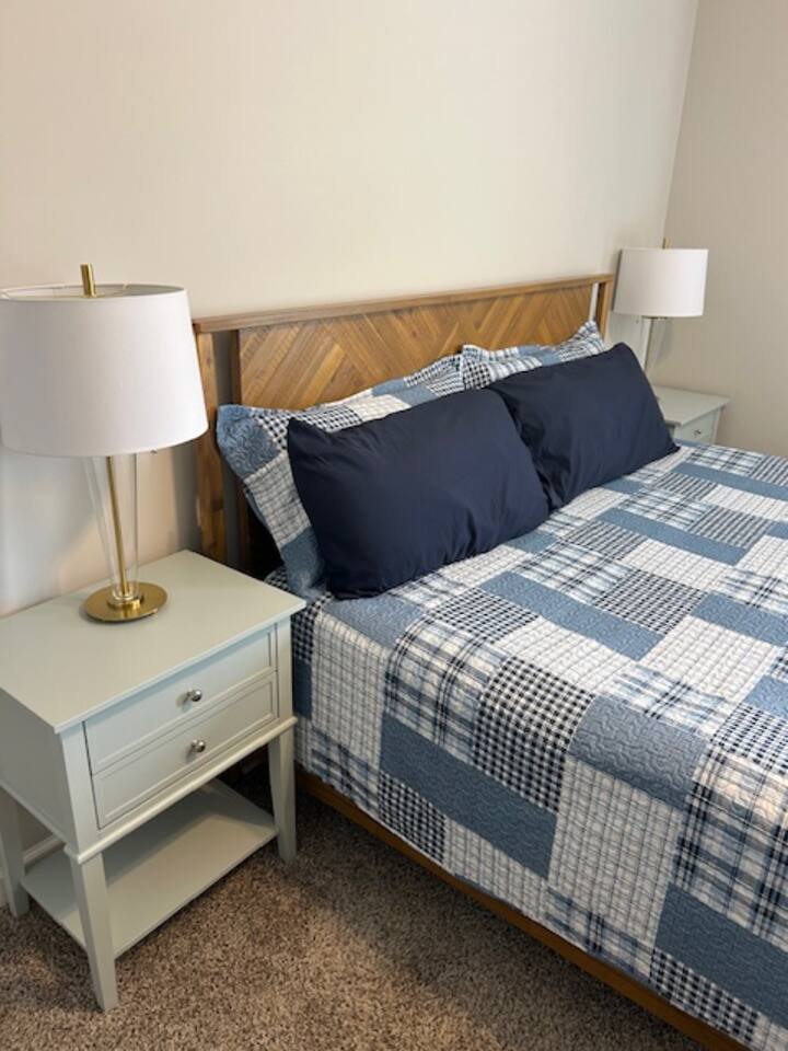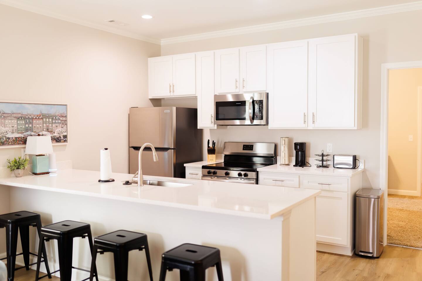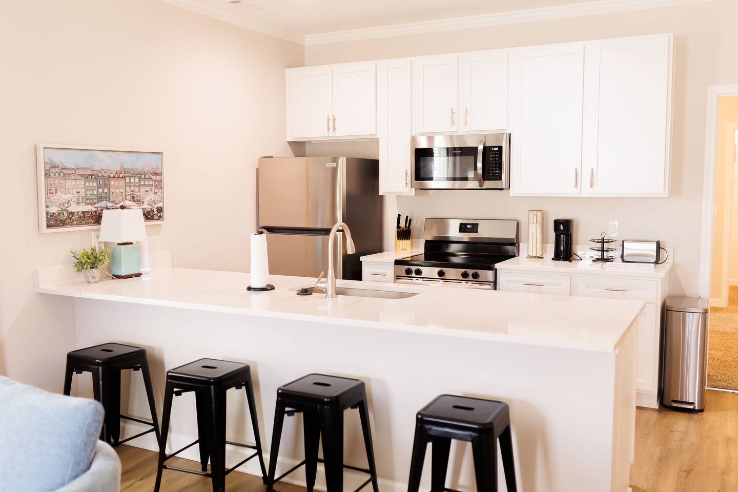 This charming 2-bedroom, 2-bathroom cottage offers a perfect blend of comfort and style. The open-concept living area features cozy seating, a smart TV, and plenty of natural light. The fully equipped kitchen has modern appliances, granite countertops, and everything you need to cook at home. Both bedrooms are spacious with comfortable beds and plenty of storage. The primary bedroom includes an en-suite bath for added privacy. Outside, enjoy a peaceful front porch — the perfect spot for morning coffee!