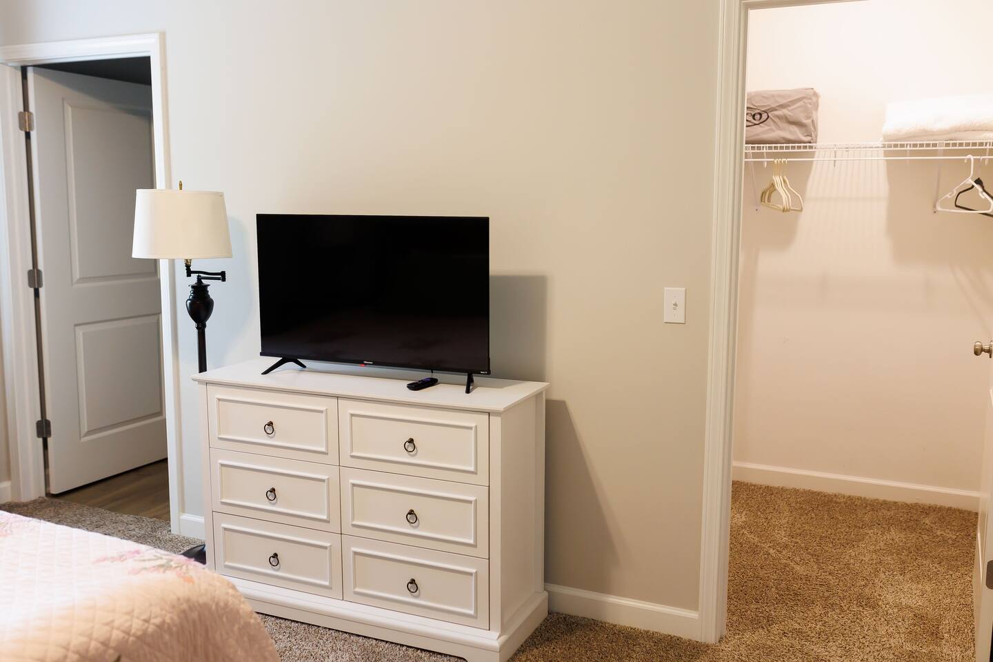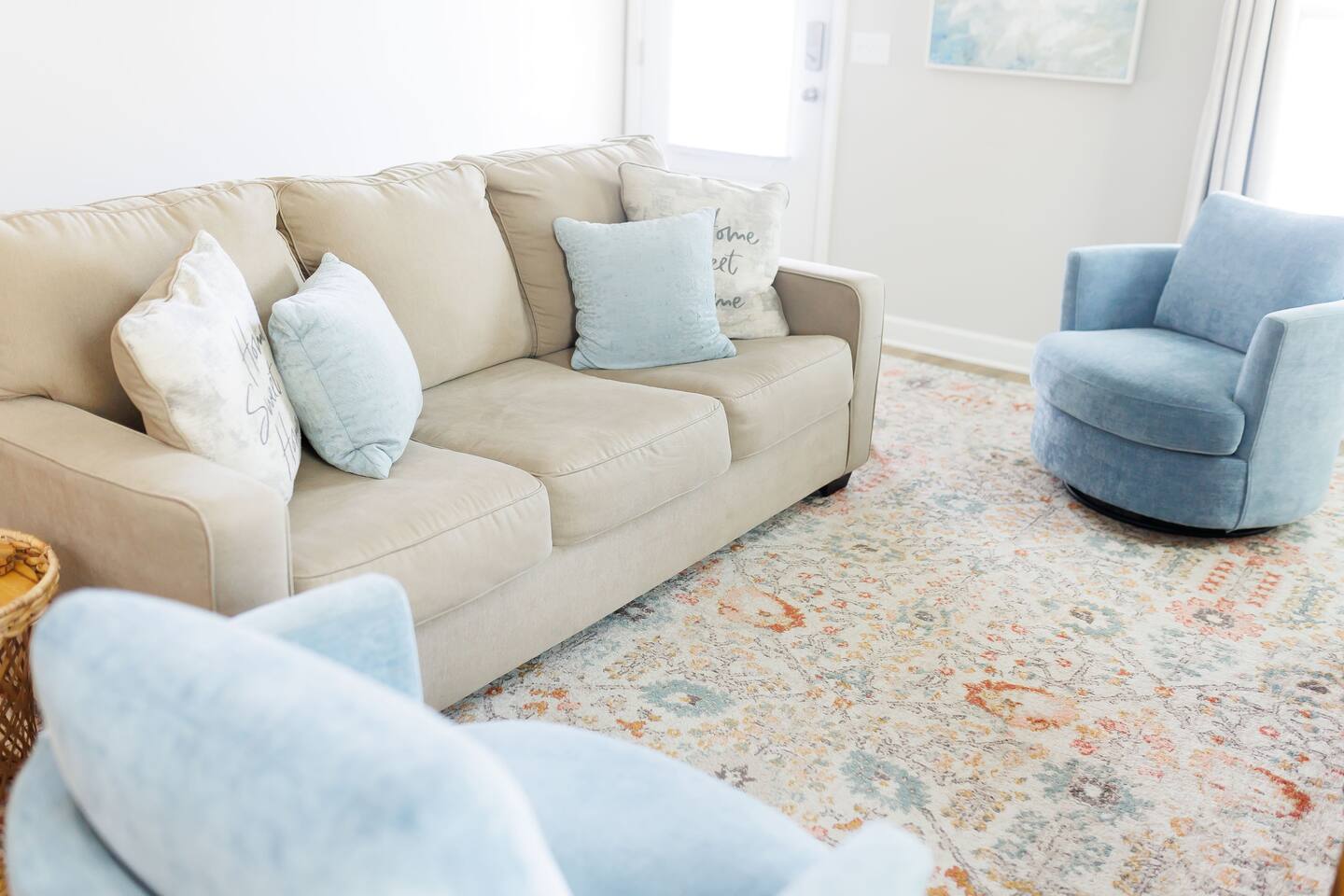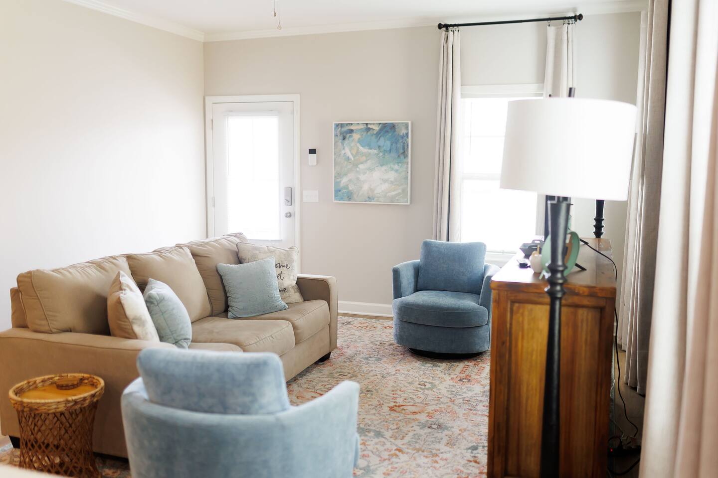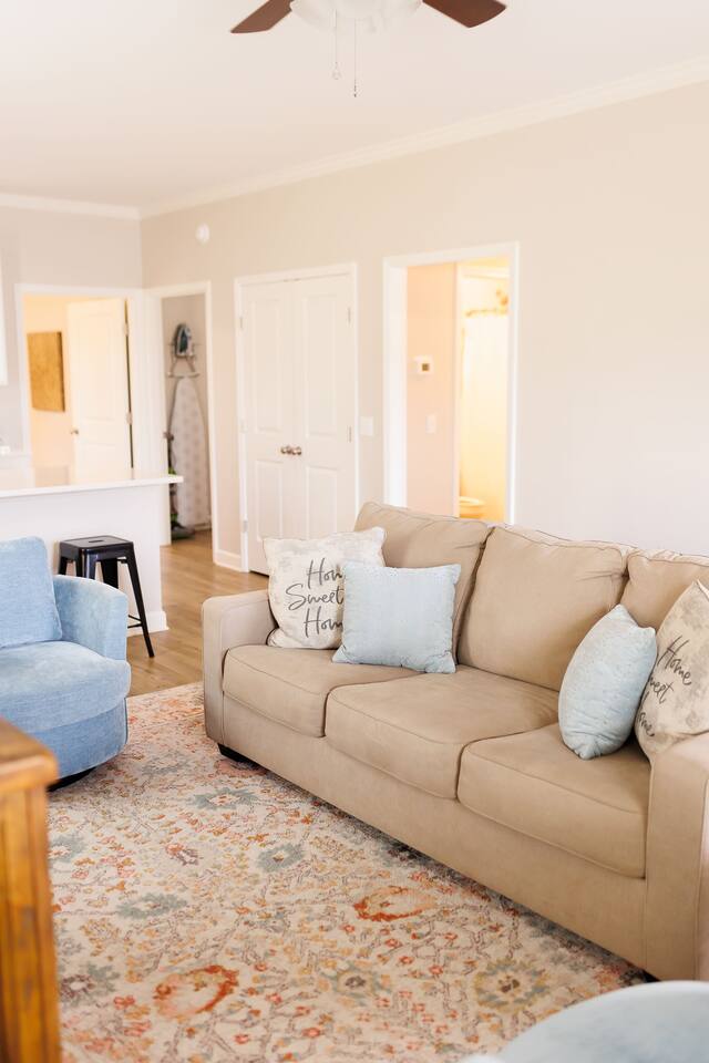 This charming 2-bedroom, 2-bathroom cottage offers a perfect blend of comfort and style. The open-concept living area features cozy seating, a smart TV, and plenty of natural light. The fully equipped kitchen has modern appliances, granite countertops, and everything you need to cook at home. Both bedrooms are spacious with comfortable beds and plenty of storage. The primary bedroom includes an en-suite bath for added privacy. Outside, enjoy a peaceful front porch — the perfect spot for morning coffee!
